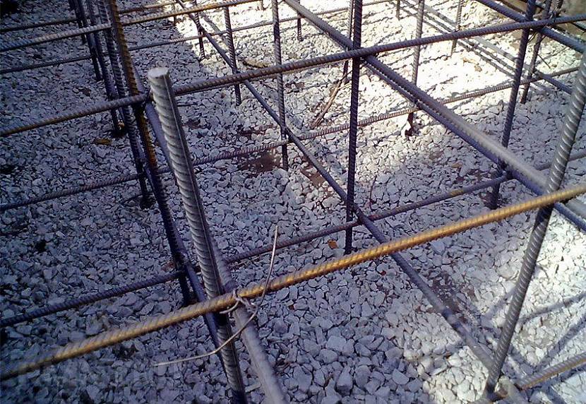 - Затем установить на расстоянии до 5 см от песчано-гравийной подушки горизонтальный арматурный пояс, укрепить его колышками или уплотнителями. Арматура не должна соприкасаться с подушкой и боковыми стенками опалубки.