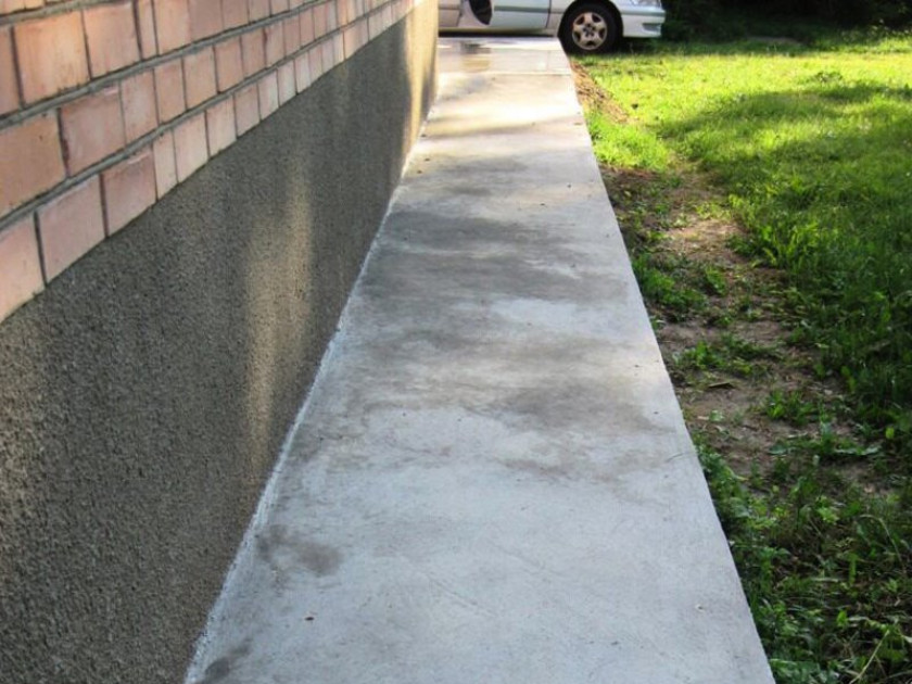Устанавливают снаружи после завершения строительства здания. Отмостка защищает фундамент от дождевой и талой воды. Эффективность зависит от ширины. Узкое покрытие не обеспечит отвод воды на безопасное расстояние. Отмостку делают: