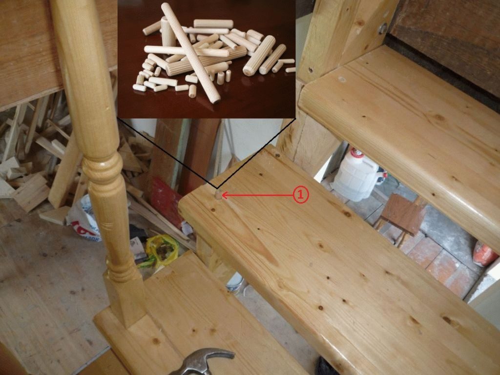 Для закрепления элементов на ступени или тетиве, необходимо разметить точки установки, которые должны располагаться на одной линии. В местах разметки просверливают углубления для шкантов. Выступающий торец последних следует тщательно промазать клеем, а затем вставить их в полученное углубление.