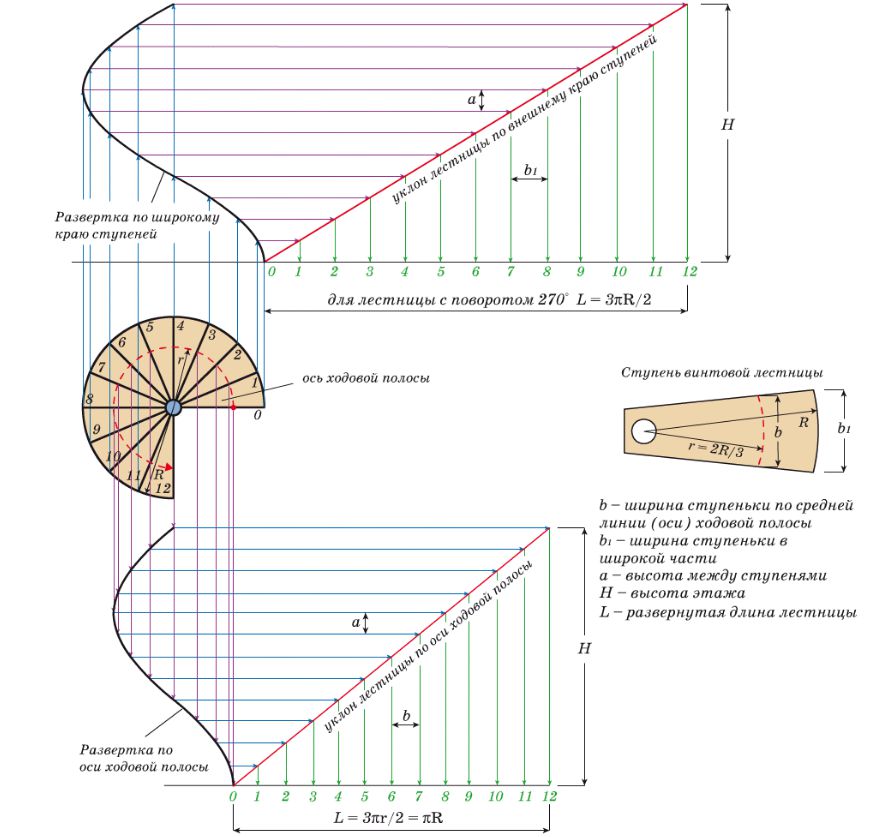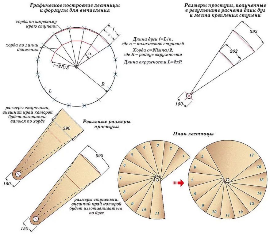 Для расчета лучше использовать математические формулы. Для начала, необходимо узнать длину окружности конструкции. Удобнее всего это сделать с помощью формулы 2*3,14*r, где r – ширина пролета. К примеру, при ширине пролета в 1000мм окружность будет равняться 6280мм. Чтобы получить ширину ступени с внешней стороны, достаточно данное расстояние поделить на количестве ступеней в одном пролете. Для примера, при 10 ступенях расстояние будет равняться 628мм, которые позволят создать ровную лестницу без пустот.