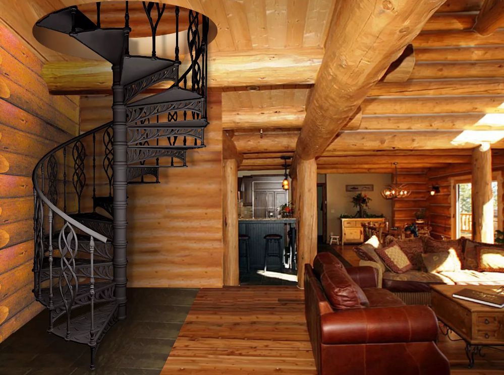 Винтовая лестница имеет свой особенный внешний вид, за счет которого появляется возможность создания совершенно непохожего ни на что дизайна. Кроме этого, винтовая конструкция позволяет сэкономить много места на обоих этажах, сделав помещение более эргономичными.
