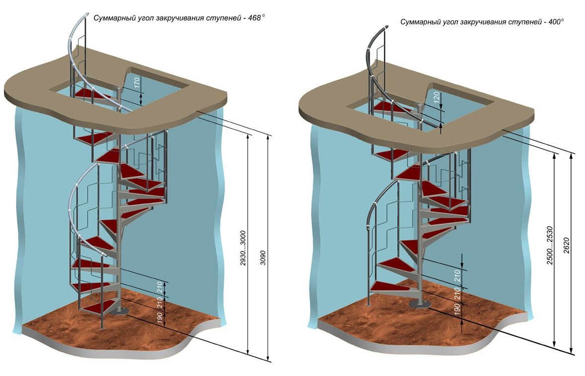 Винтовая лестница представляет собой круг, потому диаметр равен сложению ширины проходов и, если лестница строится с центральной опорой, размера опоры. В среднем, диаметр подобной конструкции равняется 1600-2000мм, которых хватает для её удобного использования вне зависимости от особенностей. Более подробно в таблице ниже