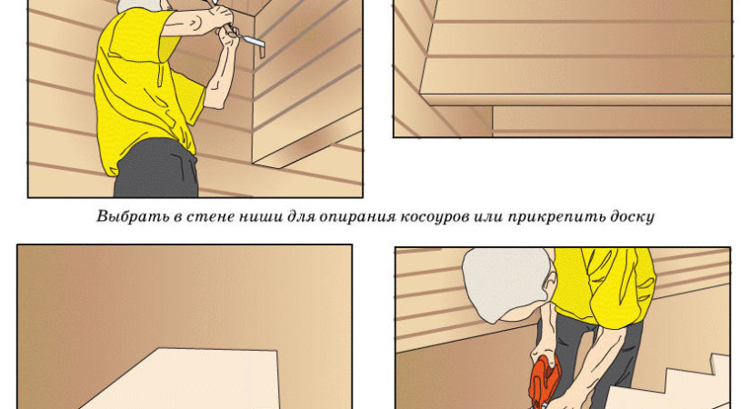 - Верхний конец косоура закрепляют на противоположной стене, а для обеспечения жесткости марша, по длине косоура устанавливают опорные столбы. Количество столбов зависит от протяженности пролета, обычно одна опора устанавливается на каждые 4-5 ступеней. Для крепления косоура к стене используют саморезы и крепежные элементы (уголки);
