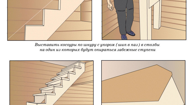 В отличие от тетивы, косоуры можно изготовить методом сборки. При этом отдельно изготавливают балку и треугольники, в соответствии с размером подъема и шириной проступи. После этого из них собирают готовый косоур.