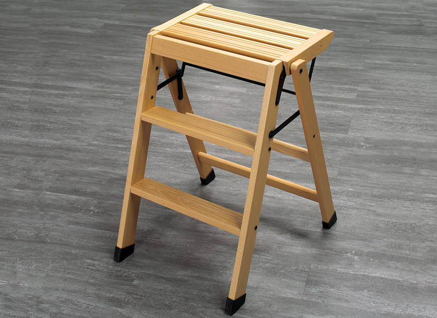 - Стремянка-табуретка – еще одна конструкция, что составлена из высокого стула, плюс — выдвигающегося модуля (он, когда нет необходимости, убирается назад, под сиденье табуретки). Изделие имеет пару ступенек, а сиденье, конечно же, применяется в роли 3-й ступени.