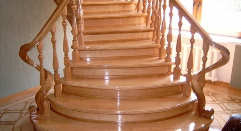 Далее устанавливают ограждение лестницы. На заключительном этапе деревянные элементы шлифуют и покрывают лаком. Для обеспечения долговременной службы конструкции, необходимо нанести 2-3 слоя покрытия.