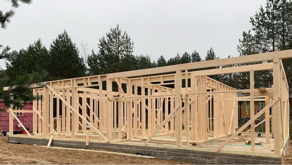 Делают из доски, цельного или клееного бруса (который является самым прочным, качественным и дорогим), а также деревянной двутавровой балки (дерево + ОСП + дерево). Стандартное сечение стойки — 50 х 150 мм. От качества дерева зависит долговечность и прочность дома. Главное требование — влажность пиломатериалов должна быть не выше 18%. Дома с деревянным каркасом наиболее распространены.