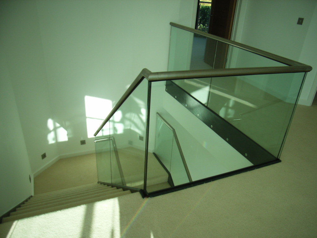 Можно использовать для стеклянного ограждения и обычное закаленное стекло с противоударной пленкой (в случае разбивания, стекло остается на пленке) либо без нее. Такие ограждения можно ставить внутри помещения и на малых высотах.