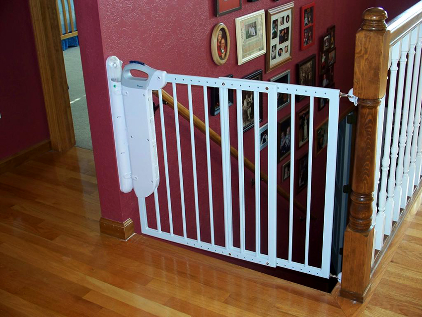 Не хотите сверлить стены? Можно приобрести ворота, устанавливаемые враспор. Единственным их недостатком можно назвать обязательную нижнюю планку, через которую можно споткнуться. По этой причине такое решение не используется для установки вверху лестницы. Однако оно подойдет для нижней ее части или для дверного проема.