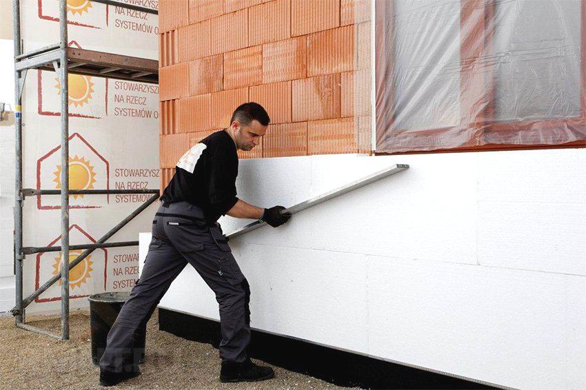 Пенопласт не впитывает влагу, поэтому его можно применять как для утепления фасада, так и для фундамента или цоколя
