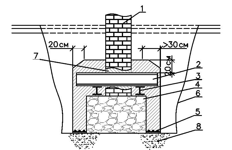 Усиление фундамента двухсторонней банкеткой: 1 – существующий фундамент; 2 – несущая балка банкета; 3 – разгрузочные балки; 4 – банкет из монолитного бетона; 5 – арматурные сетки; 6 – откосы котлована; 7 – штраба в фундаменте для установки балки; 8 – щебеночное уплотнение основания.