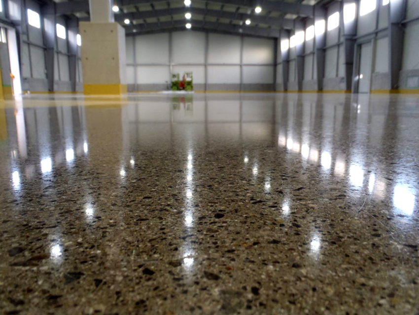Состав равномерно распределяется по поверхности. После того как впитается лишняя влага, плоскость разглаживается. Затем вновь наносятся остатки топпинга, после чего поверхность снова требуется затереть. Спустя 3 часа плоскость шлифуется и обрабатывается кюрингом – специальной пропиткой для бетона. До окончательного застывания поверхности закрываются пленкой. Через 2-3 дня с помощью болгарки выполняются компенсационные швы, уходящие глубоко в поверхность плиты, которые заливаются полиуретановым наполнителем с целью полной герметизации.