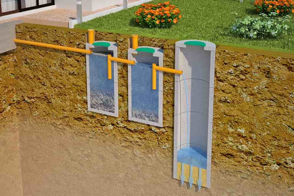 Такой вариант канализации подходит для участков, где можно расположить колодец на расстоянии более 30 метров скважины, расстояние от дома и забора должно быть как минимум 2 м, от больших кустарников и деревьев — 3 м. Также, грунт должен иметь высокие фильтрующие свойства, поэтому можно использовать любой вид почвы, кроме глины. Кроме того, грунтовые воды должны протекатьна глубине от 1,5 м, то есть быть ниже, чем дренажный уровень.