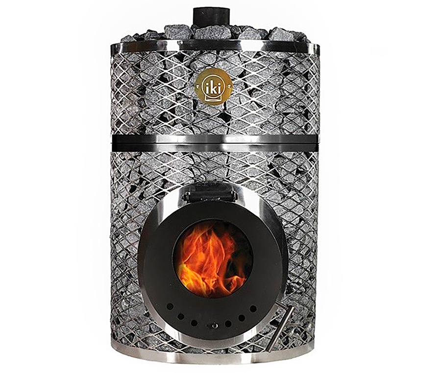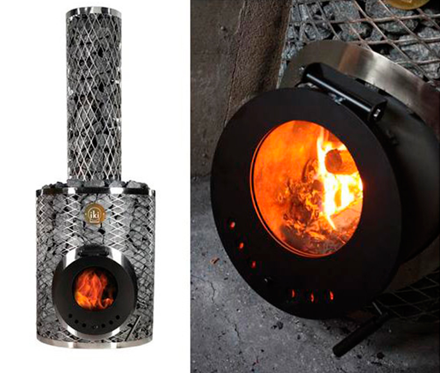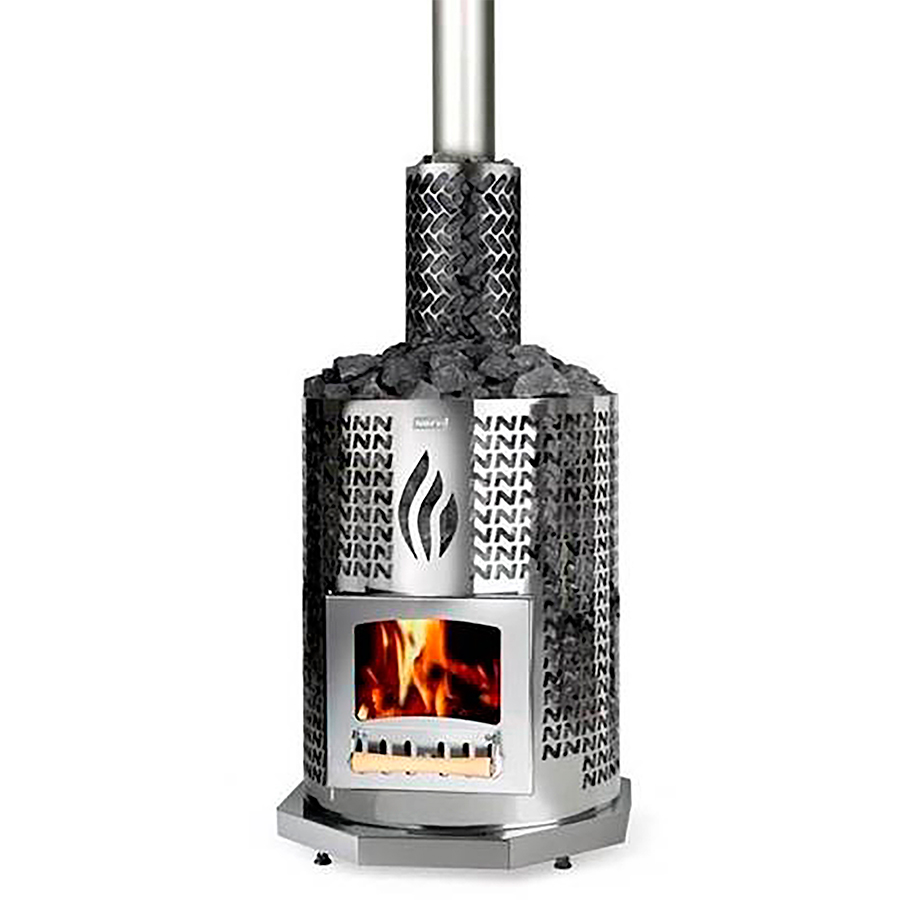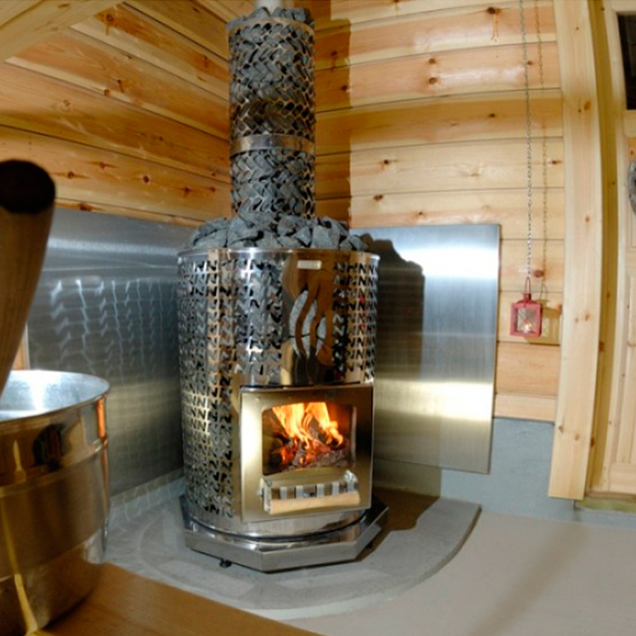 Дровяная печь с системой длительного горения. Выполнена из четырехугольной сетки из нержавеющей стали. Большой стеклянный люк на передней части хорошо освещает пол в парилке. Тяга регулируется поддувом. Скорость нагрева высокая. Температура камней варьируется в разных местах печи.