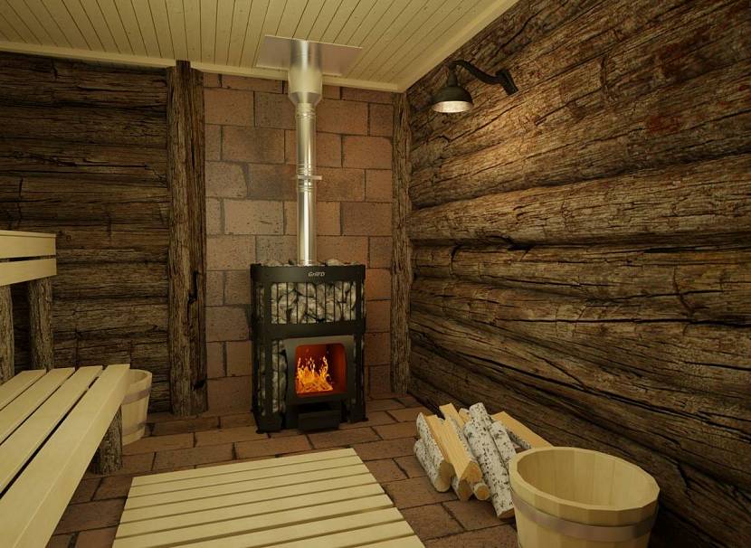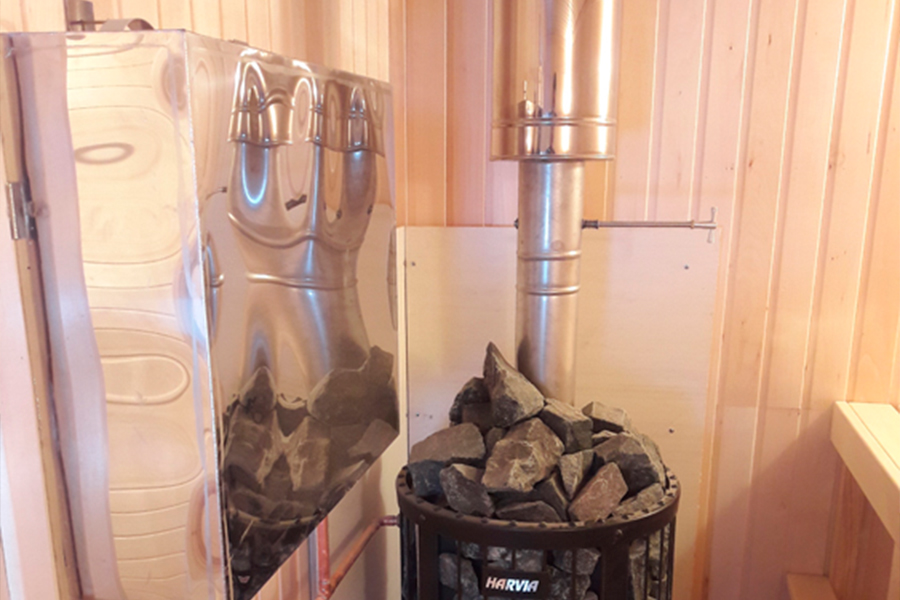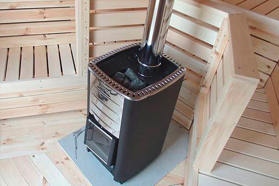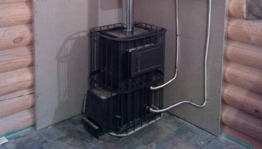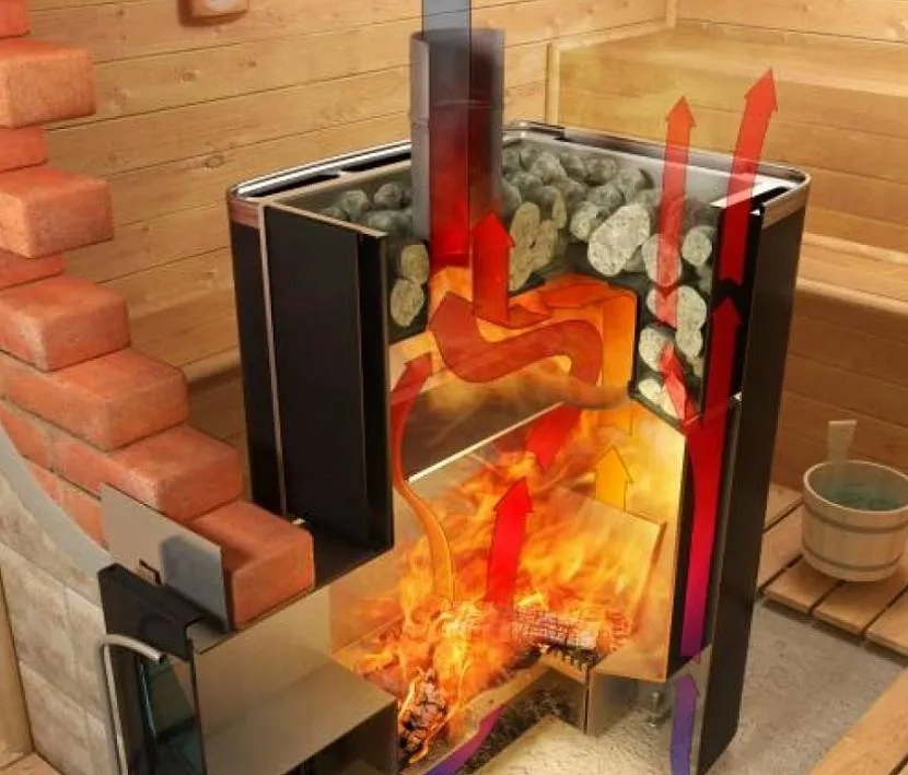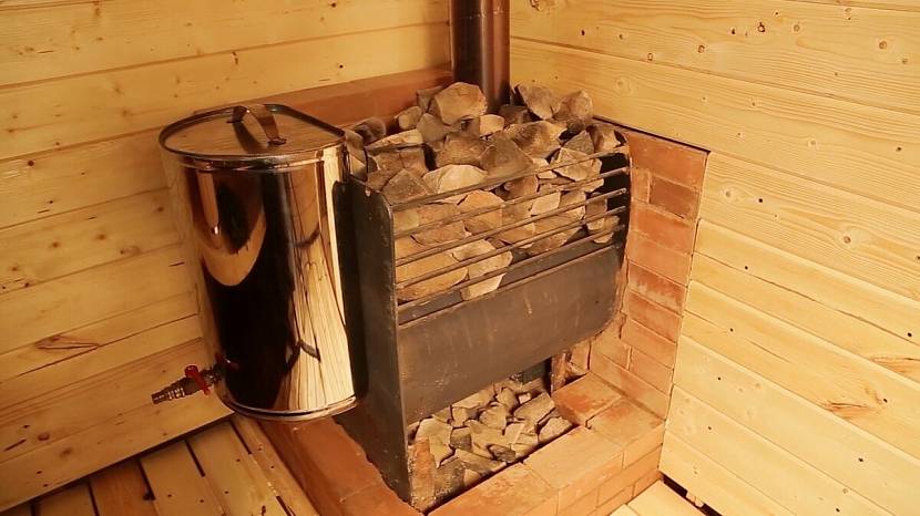 Дровяные печи оснащены баком, в который заливают воду для получения пара от камней. Влажность при этом будет небольшой, но прогревание равномерным. Для увеличения тепла, нужно подбрасывать воду на камни.