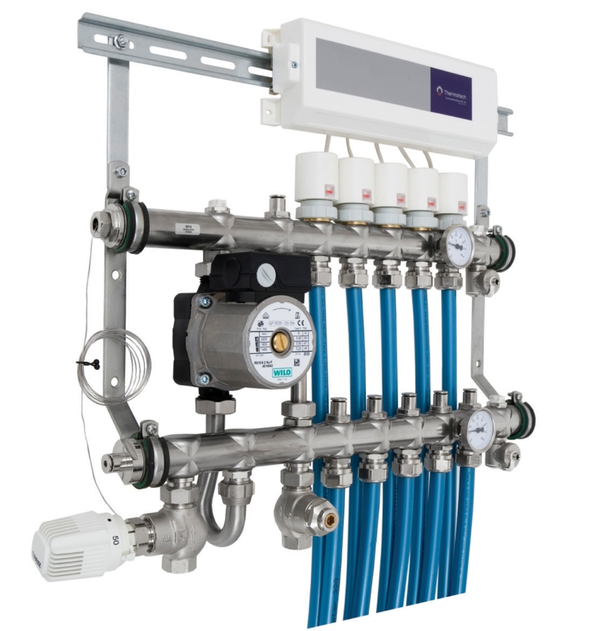 Распределительно-регулирующий узел теплого пола выглядит следующим образом: