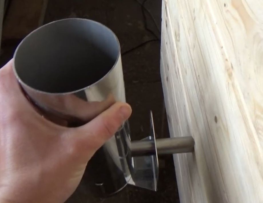 В крышке просверливается отверстие и в него вваривается трубка таким образом, чтобы нижняя часть выступала за плоскость крышки не более, чем на 1 см, а верхняя поднималась над ней на 5-10 см. Верхний срез желательно закруглить на точильном станке, чтобы легче было надеть пластиковый или резиновый шланг для отвода дыма из кухни.