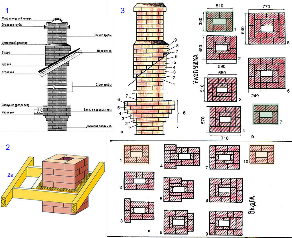 Устройство дымохода из кирпича показано на поз. 1 рис. Выкладывается он из печного кирпича на известково-цементном растворе (цемент М400 : известь : песок 1 : 2 : 5) обязательно по шаблону (поз. 2), башмак которого 2а опирается на стену. Расширение трубы над кровлей (выдра) и оголовок трубы вместе не допускают задувания порывами в трубу и протекания крыши по стыку ее с трубой. Для того и другого шейка трубы между выдрой и оголовком должна содержать не менее 3-4 рядов кладки. Ровная часть выдры должна состоять не менее чем из 2-х рядов. С учетом наклона крыши всего на выдру приходится 7-8 рядов кладки (ряды 2-9 на поз. 3 вверху слева и внизу). Если вам предложат проект дымохода с выдрой менее чем на 7 рядов, а крыша у вас обычного уклона – халтурщики или неумехи.