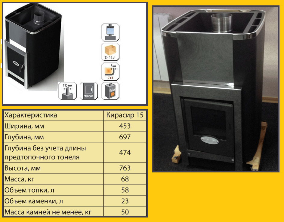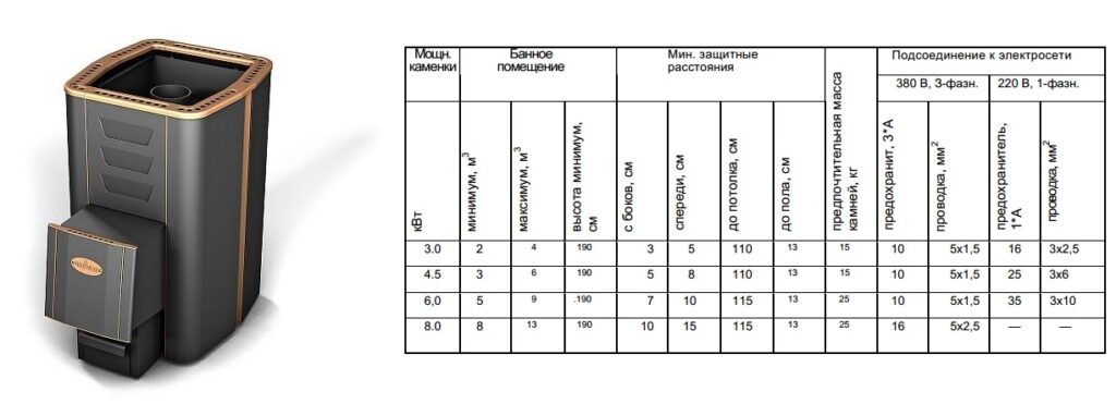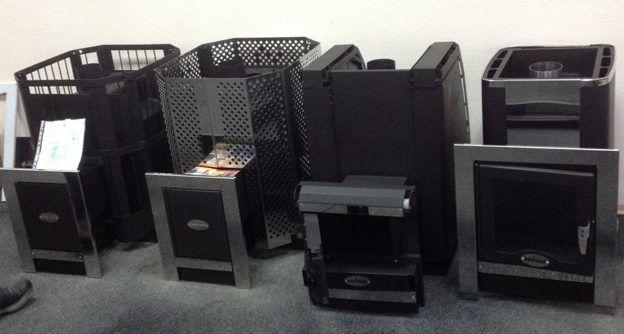 Пользователь может подобрать модель, соответствующую по мощности размерам своей бани. Есть печи в защитной оболочке (сетки), существуют модели с удлиненной выносной топкой. Предлагаются разные модели каменок, уложенных в сетку или размещенных в специальном отсеке над топкой.