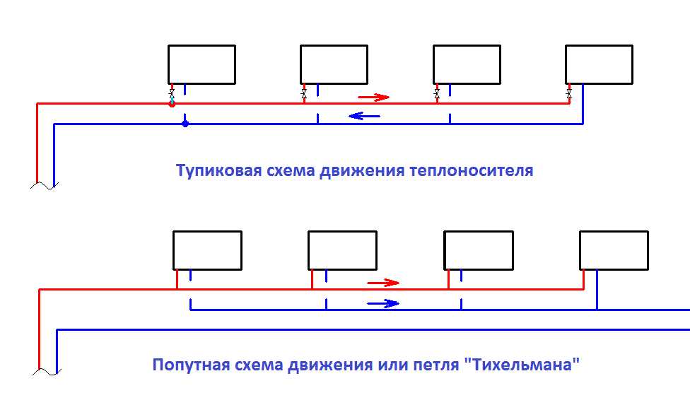 - Тупиковая циркуляция теплоносителя предполагает разнонаправленный ток воды.