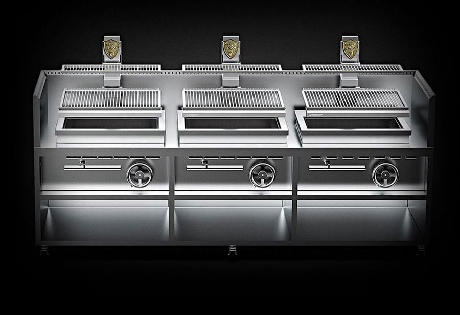 Мангалы испанского бренда Хоспер пользуются хорошим спросом благодаря высокому качеству изделий, их надежности и долговечности. Модель PVJ076-3 относится к новой линейке и представляет собой большую напольную гриль-зону с тремя выделенными рабочими поверхностями. В каждой секции помимо топки обустроен свой подъемный механизм для решеток. А за счет выверенного угла наклона лишний жир и масло стекают с решетки в жиросборный коллектор.