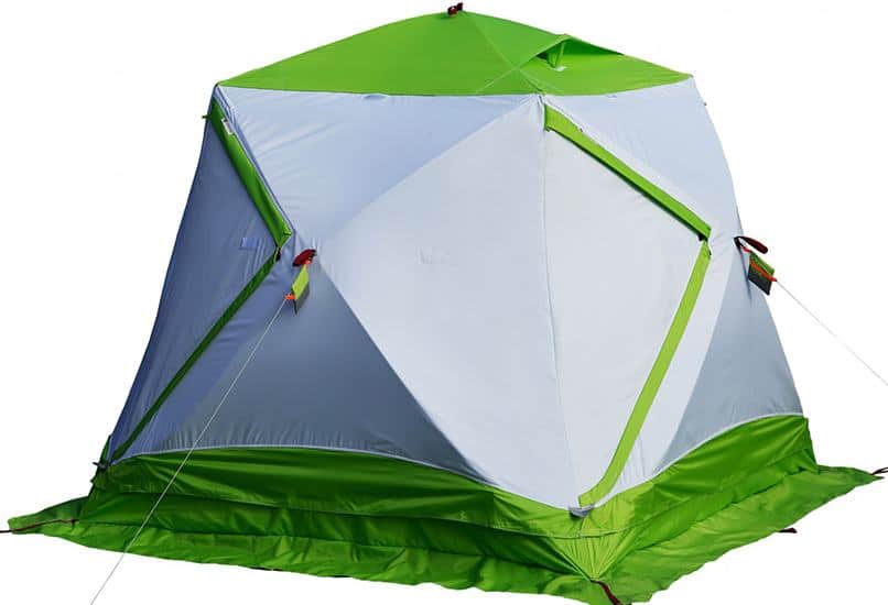 Лотос Куб 3 Компакт Термо – за модный куб придется заплатить 23 000 рублей. Он имеет полуавтоматическую сборку и основание из стеклокомпозитной арматуры. Тент состоит из трех слоев: верхний из полиэстера (Оксфорд), затем нетканый утеплитель и снова синтетика. Продумана система гидроизоляции дна. Есть удобные кармашки и держатели для размещения вещей.