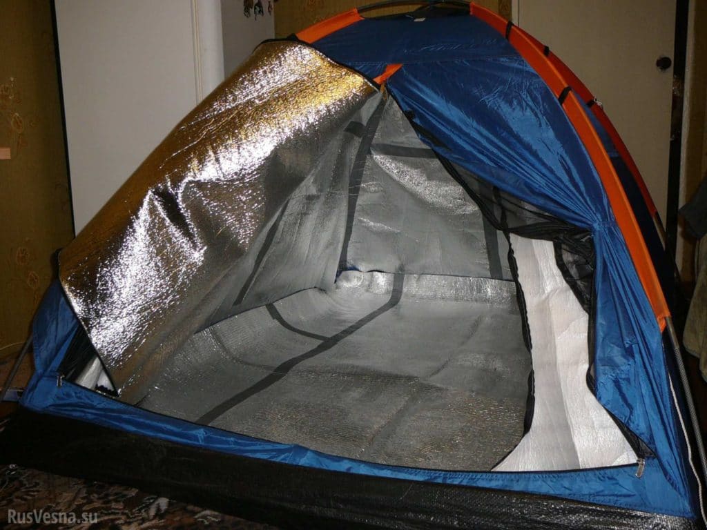 - Внутренние утеплители. В специализированных магазинах можно найти широкий выбор изотермических утеплителей на основе синтепона, силикона и тому подобное. Обшиты они двусторонней дышащей тканью и отлично защищают от влаги. Стоимость их, конечно, довольно приличная, но и гарантию тепла они дают солидную. Есть и более бюджетный вариант: теплоотражатель на фольге, закрепляющийся на внутренних стенках при помощи зажимов. Повозиться с ним на холоде придётся, но тепло от нагревателя будет задерживаться внутри палатки намного дольше.