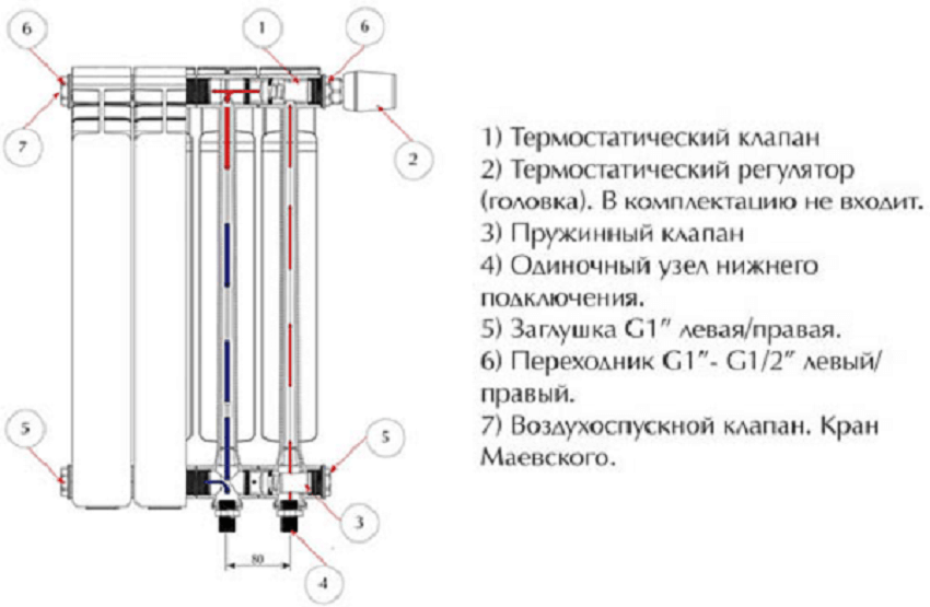 Перед тем, как демонтировать устройство своими руками, нужно остановить подачу теплоносителя и сбросить давление. На схеме представлен биметаллический радиатор в разрезе – она поможет сориентироваться в последовательности работ.