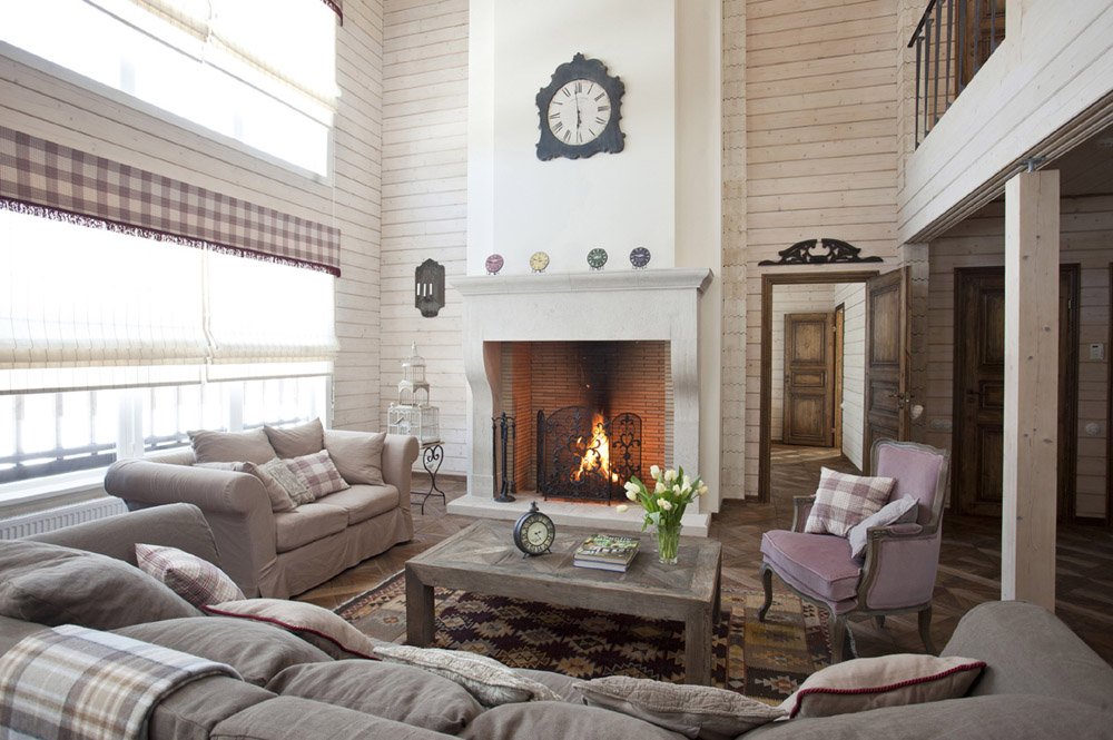 - Использование неброских цветов. «Французский кантри» не терпит ярких акцентов в интерьере. Это стиль, который привносит в дом чувство спокойствия и умиротворенности. Камин необходимо делать в бело-коричневой гамме. Подойдет камень цвета слоновой кости, а также отделка при помощи деревянных панелей.