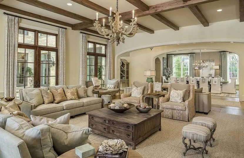 Комната для сбора семьи и гостей — эпицентр уюта. Главным акцентом в доме может быть камин, в квартире — непременно большой и комфортный диван с большим количеством подушек. Чтобы последний притягивал на себя как можно больше внимания, выбирайте модели с узором — цветочным или геометрическим, в зависимости от направления стиля.