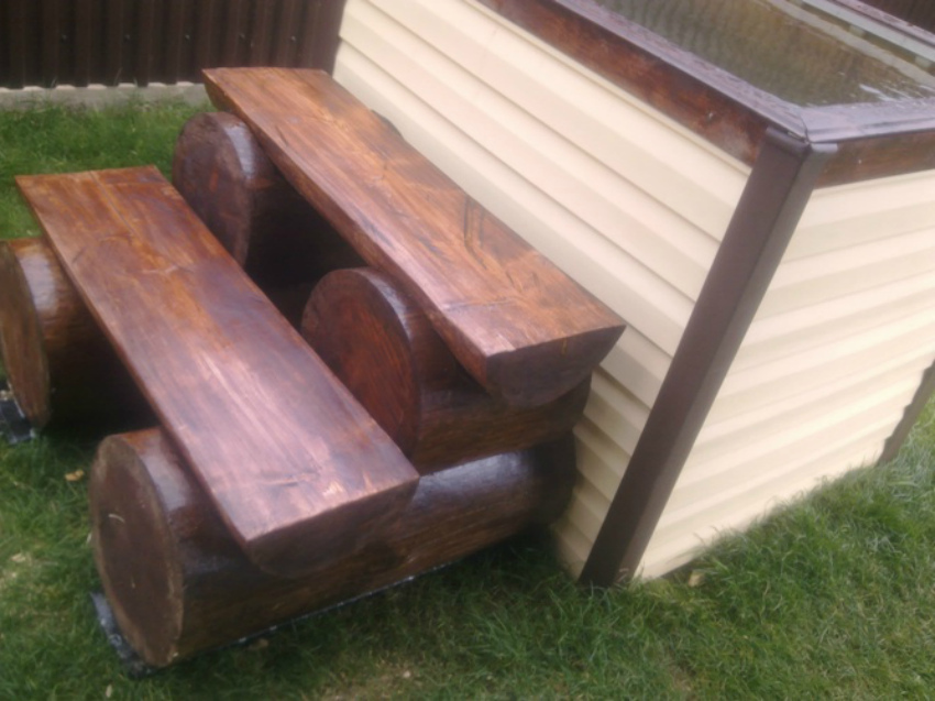 Сооружаем лестницу или ступени. На фото — вариант ступеней из бревен. Обработать бревна и покрасить в цвет вагонки.