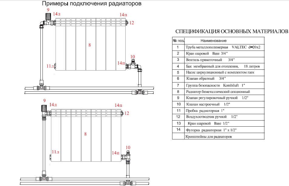 Трубопровод подходит к батареям снизу или сбоку, и выполняется по одно- или двухтрубной схеме.