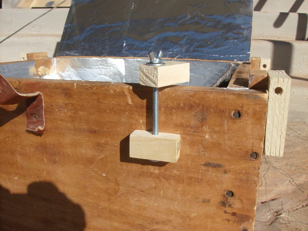 Фиксировать отражатели в рабочем положении автор предпочел при помощи подпорок сделанных из металла.Так как внешняя поверхность солнечной печи из фанеры, которая ничем не закрыта, то для защиты от внешних воздействий автор решил покрыть ее антисептиком. После чего она была покрыта защитным слоем краски.