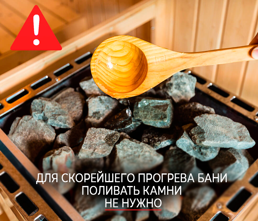 Часто встречаются советы, что для скорейшего прогрева бани нужно поливать камни. Следовать им не нужно.