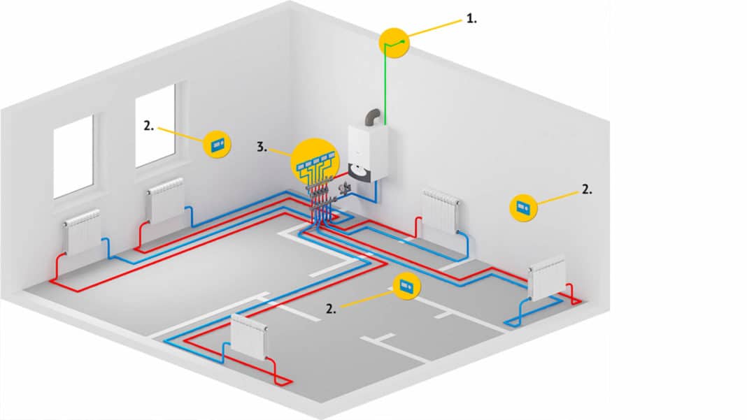 Принцип лучевого обогрева в том, что разводка от коллектора, основного распределителя теплоносителя, подразумевается для каждого радиатора в отдельности. Это самый существенный плюс в данной системе — радиаторы можно включать и отключать, как по отдельности, так и группой.