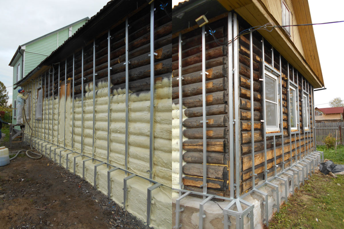 Для утепления построек из брёвен и бруса более востребован жидкий утеплитель, который при нанесении на поверхность образует плотную пену, а затем быстро полимеризуется и застывает.