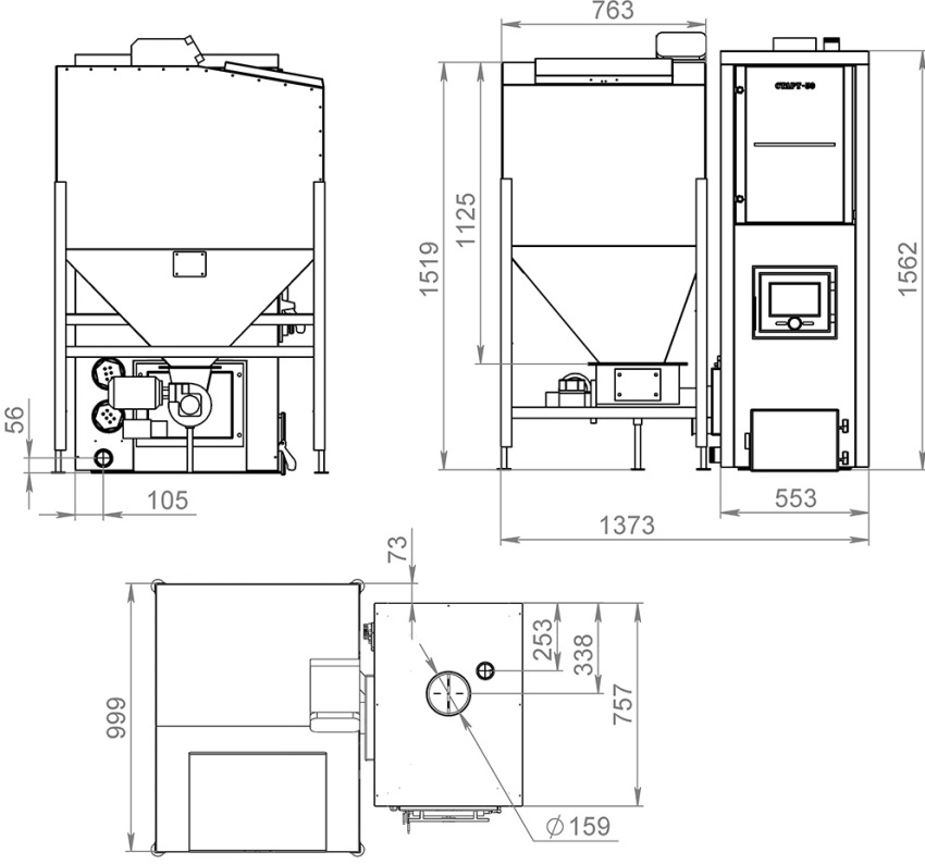 - В специальном бункере, изготовленном из нержавеющей стали, хранится определенный запас пеллет. Наличие бункера значительного объема позволяет заправлять его топливом с периодичностью один раз в несколько дней.