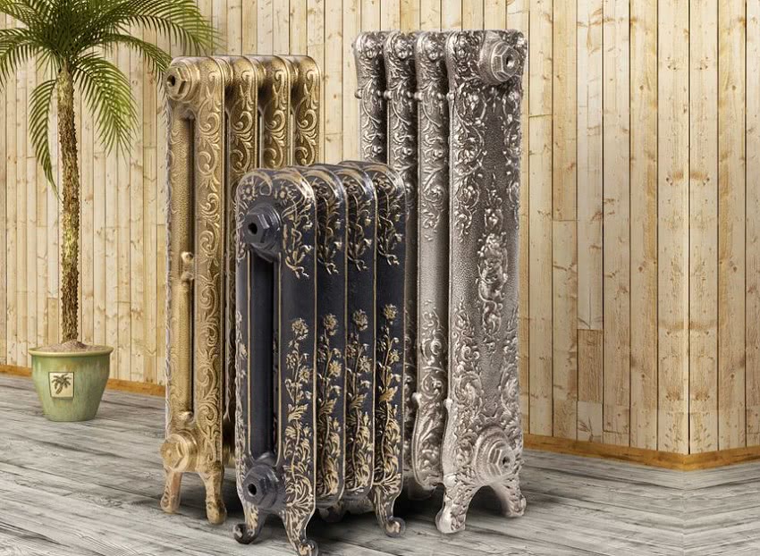 Выпускаются и новые модели, имитирующие старые чугунные «гармошки». Они в точности имитируют общее строение классического отопительного оборудования. У них улучшенный дизайн с художественным литьем или дизайнерской напайкой и удобные ножки снизу – для напольного расположения. Они требуют чуть больше краски и грунтовки, материалы нужно брать с запасом.