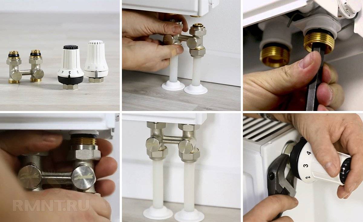 При боковом нижнем подводе труб возможна установка на радиаторе термостатирующего и регулировочного клапанов. При этом вся арматура устанавливается на «металлической» части, то есть упаковывается на резьбовых соединениях с футорками или резьбовыми штуцерами клапанов нижнего подключения. В любом случае каждый радиатор снабжается двумя запорными шаровыми кранами для возможности снятия радиатора без остановки системы. Также потребуется одна или две радиаторных пробки и кран Маевского. Герметизация резьбовых соединений традиционно выполняется паклей и уплотнительной пастой Unipak.