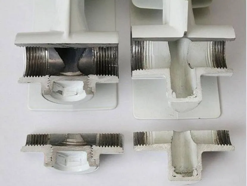 Чтобы не перепутать конструкции из разных материалов, профессионалы рекомендуют осмотреть резьбу. В биметаллическом радиаторе на участках прохода воды заметна нецелостность структуры. На серой поверхности стальной трубы виден серебристый слой алюминия. Между двумя металлами идет цветовая граница перехода.