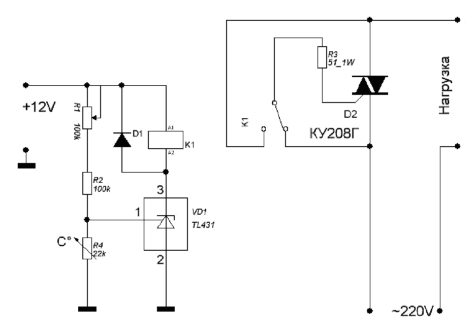 Увы, стоимость такого элемента заводского изготовления довольно высока, поэтому куда выгоднее собрать терморегулятор самому. Схема достаточно простого самодельного терморегулятора приведена на рисунке ниже.