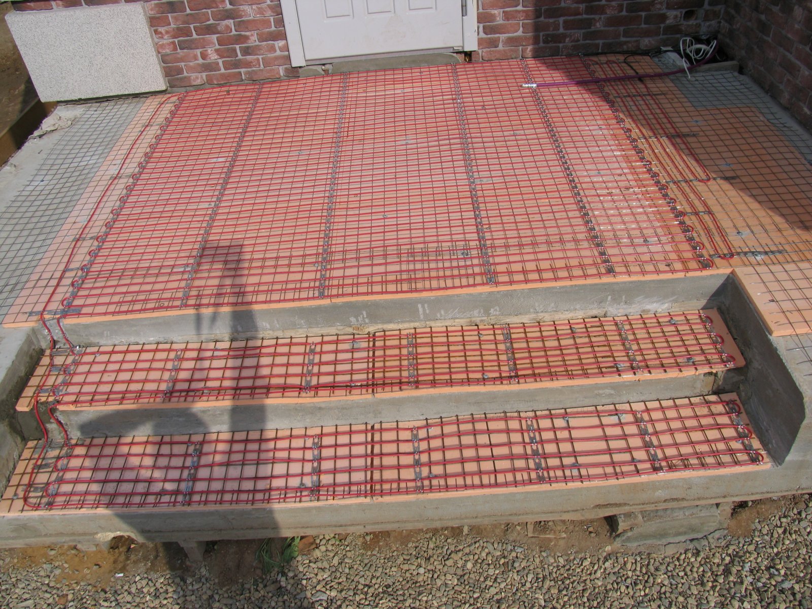 Гибкость этого материала позволяет выполнять монтаж на ступеньках крыльца, но, как и в случае с греющим кабелем не стоит допускать наложения элементов друг на друга.