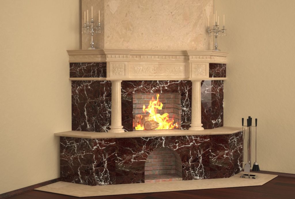 Простой, небольшой угловой камин с широкой топкой, объемным квадратным порталом, обрамленным полуколоннами, займет минимум места гостиной. Отличный проект для современно обставленных коттеджей.