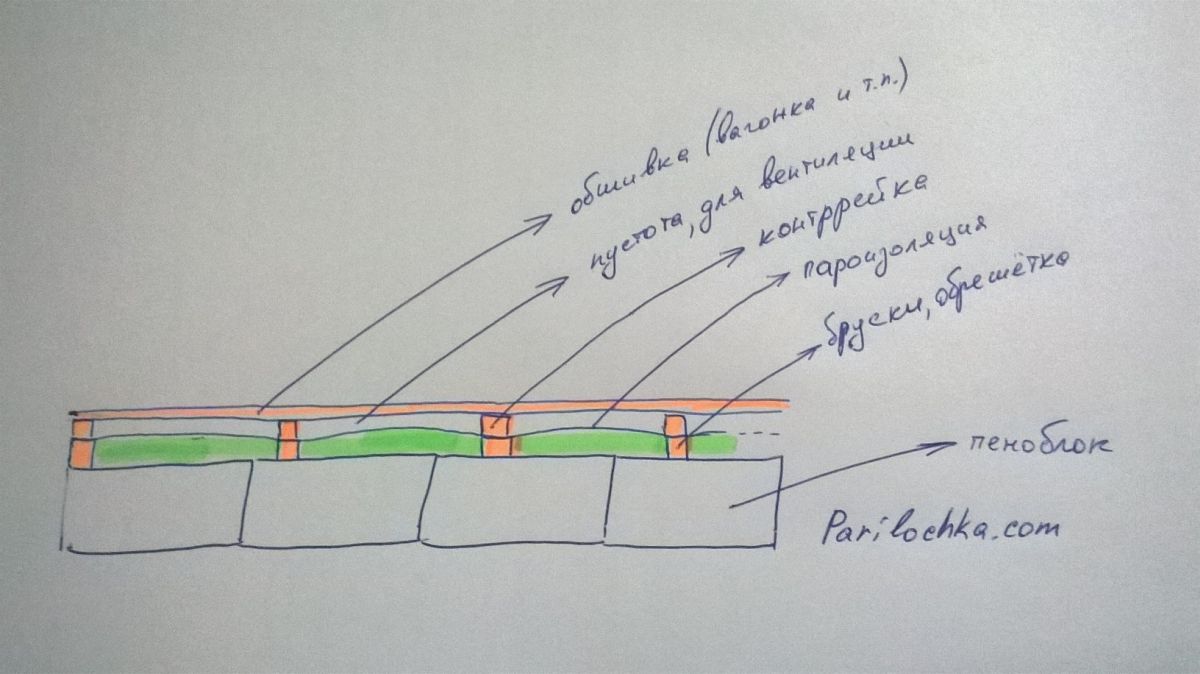 Для деревянной вагонки, то есть, для облицовки парной, нужна обрешётка, которая будет крепиться на кронштейнах, либо это будут толстые бруски, между которыми будет установлен утеплитель для бани. Второй вариант более прост, только вот смонтировать брус на блочную стену не так-то и просто, даже если она оштукатурена. Дело в том, что если толщина обрешётки будет 100 мм, то для её крепления понадобятся анкерные болты, что не совсем приемлемо для стены из такого материала.