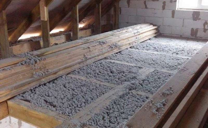 К этому типу относятся вермикулит, опилки, керамзит и листья древесины, хотя последний вариант используется крайне редко из-за недолговечности и повышенной гидрофильности. Работы по устройству утеплителя для перекрытия чердака проводятся по такой схеме: