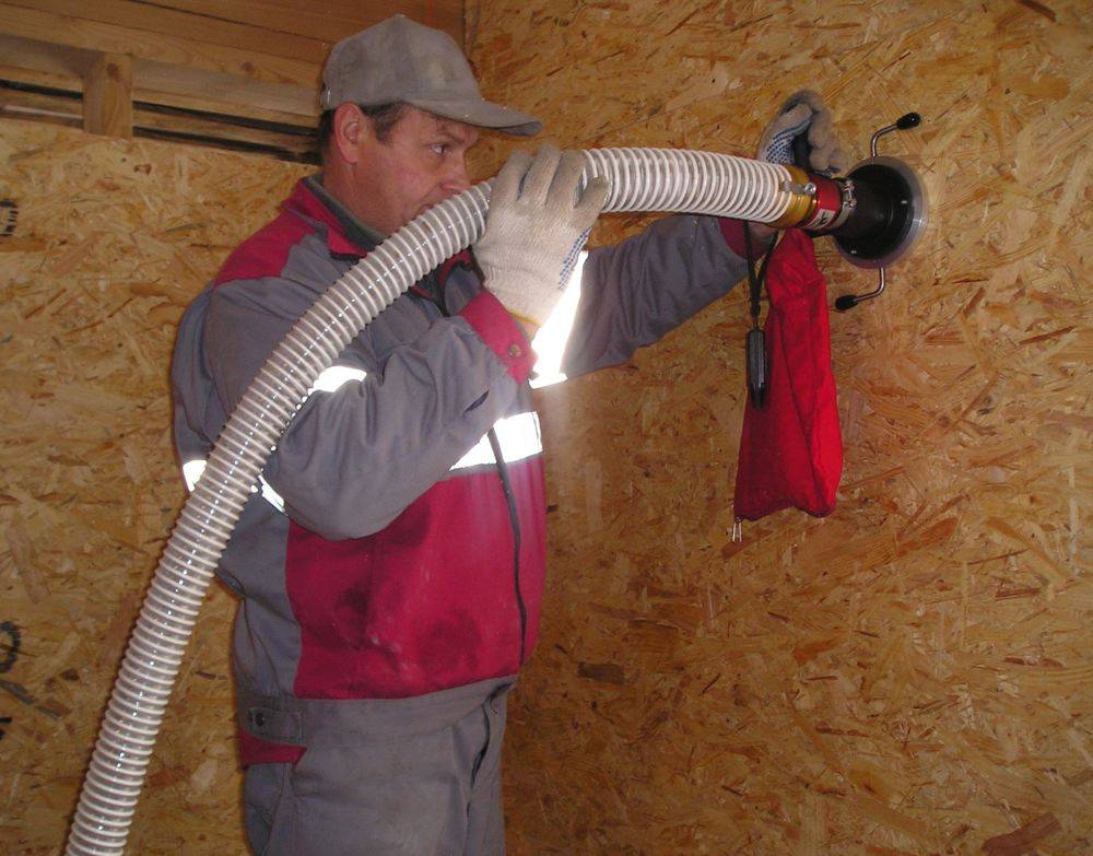 Далее отверстия по очереди соединить со шлангом. К месту монтажа поступает эковата вместе с воздухом. Благодаря этому материал в распушенном виде закрывает все щели и не оставляет свободного пространства, образуя целлюлозную пробку. Опытные мастера во избежание раздува волокон по помещению рекомендуют на конец шланга надеть перчатку, предварительно срезав «пальцы».