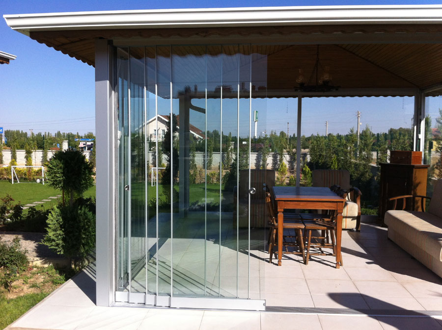 - Помимо движения влево-вправо, створки из стекла могут складываться как «книжка».