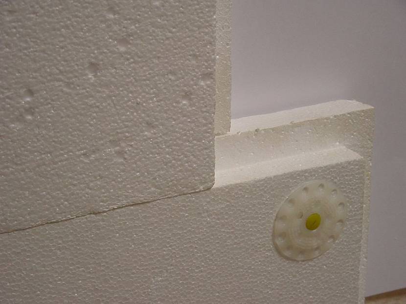Пенопласт устанавливается по схожему алгоритму. За исключением пароизоляционной плёнки – она при использовании этого утеплителя не нужна. Стыки между плитами рекомендуется задуть монтажной пеной. А каждая из плит должна быть дополнительно закреплена пятью дюбелями с «зонтиками». После застывания пены необходимо удалить её излишки и приступить к облицовочным работам.