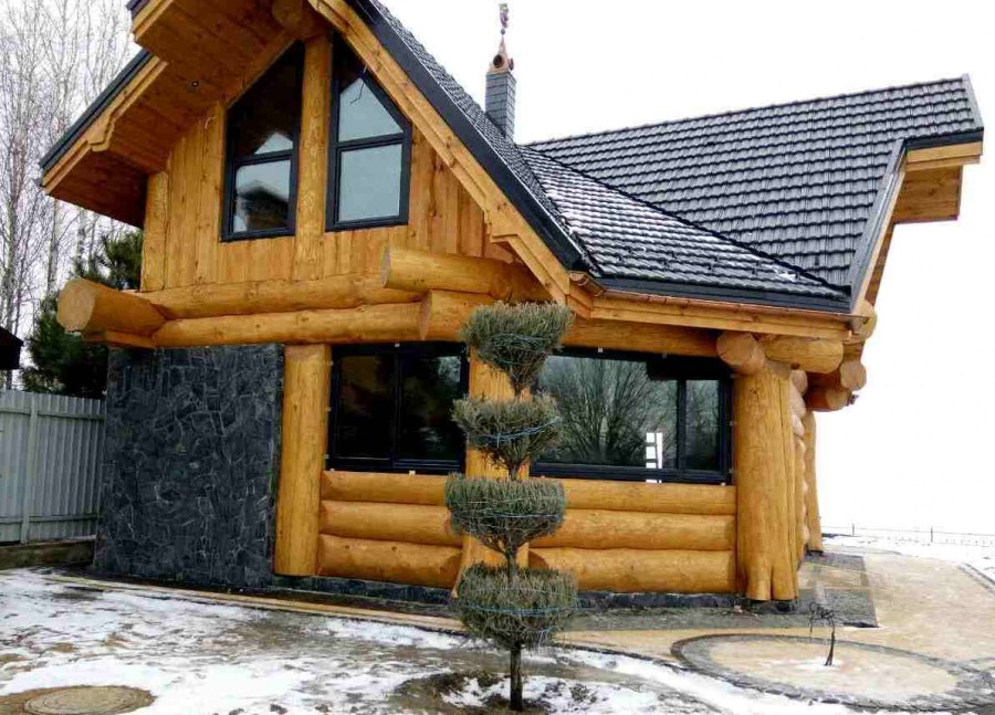 Разнообразие материалов и отделки наличников позволяет собрать композицию «под дерево», а стеклопакеты надежно сберегут тепло.
