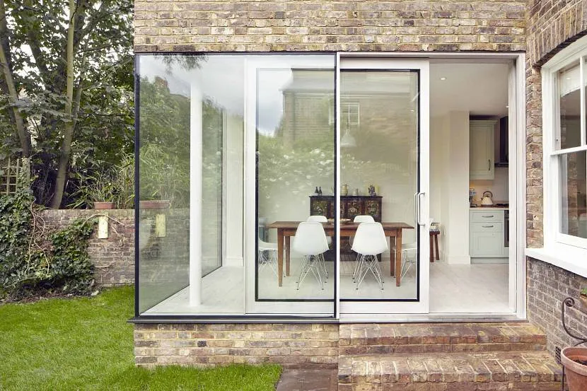 Стена из прозрачного стекла стирает границы между комнатой и участком, прилегающим к дому